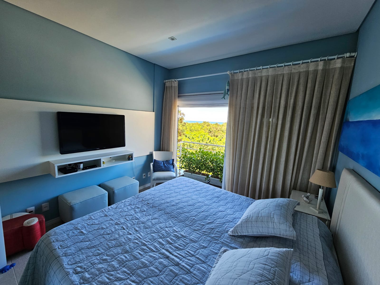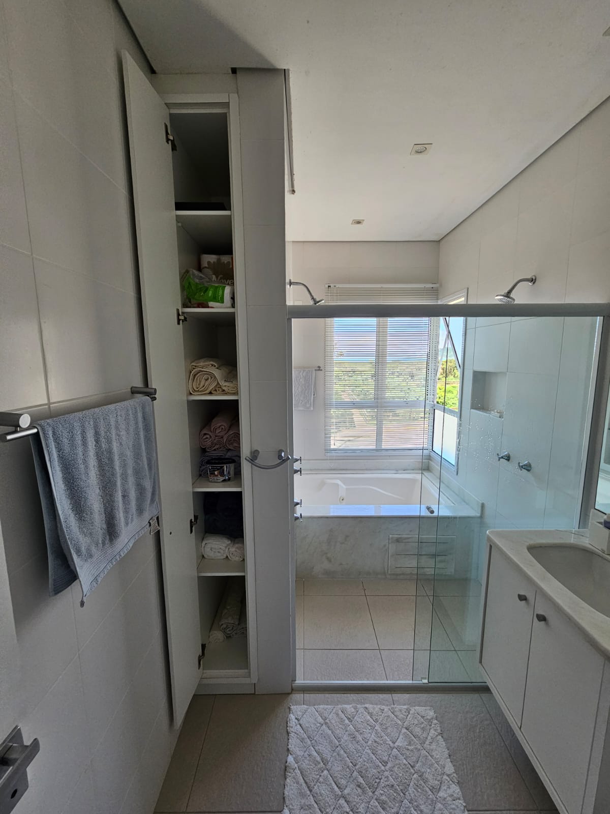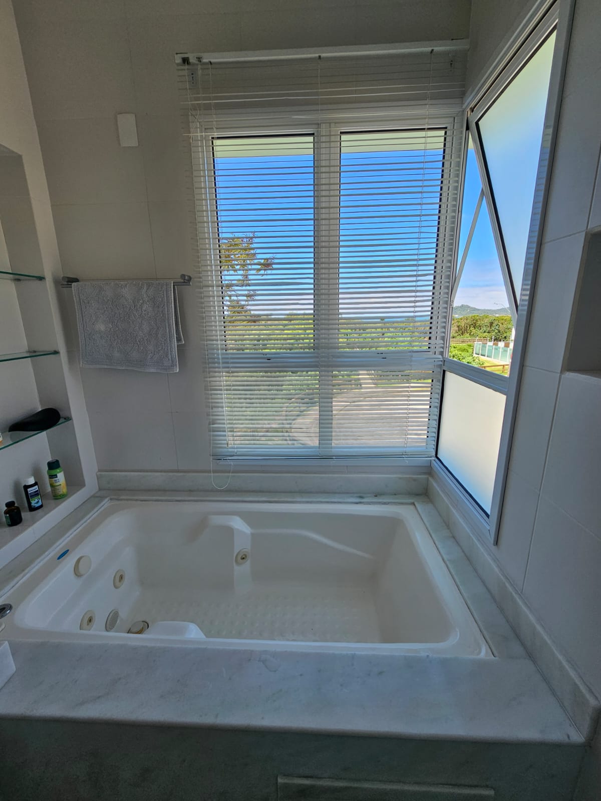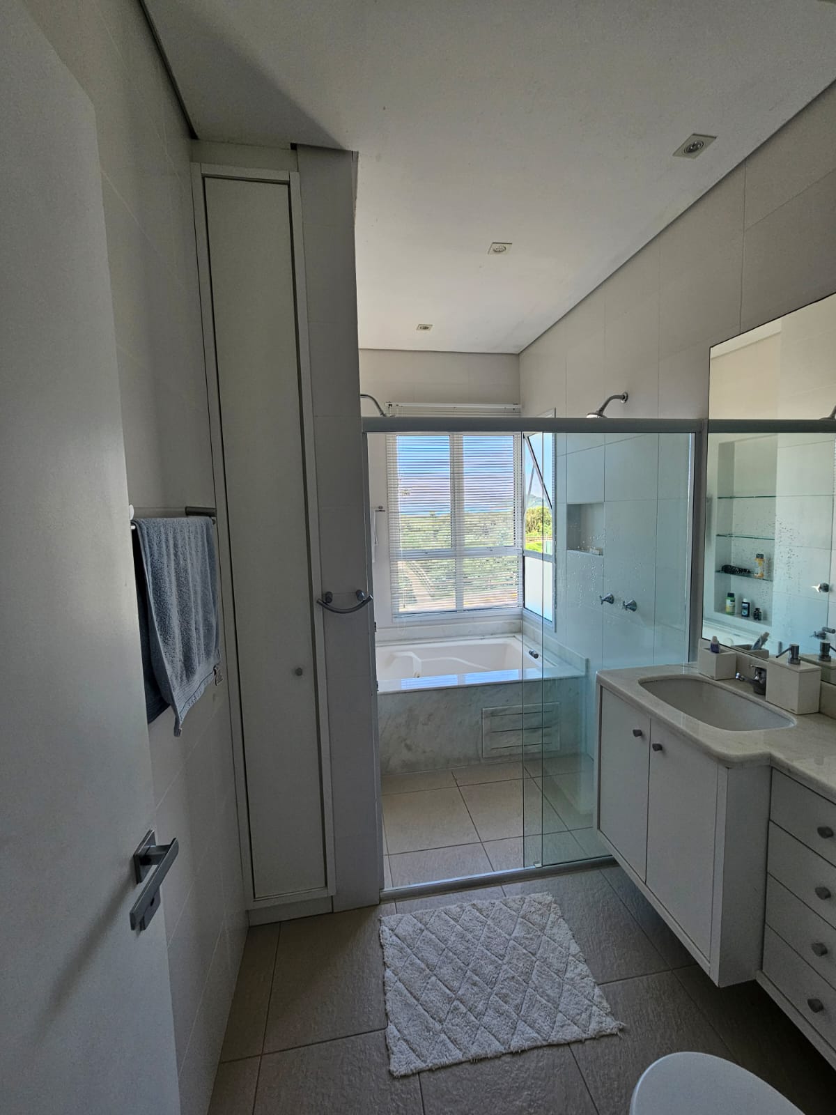 Inicialmente projetado para 3 dormitórios, foi transformado em amplas 2 suítes com armários, sendo a master com varanda, grande closet aberto e um home office. No banheiro: box com 2 chuveiros e uma hidromassagem com vista mar – relaxamento perfeito!