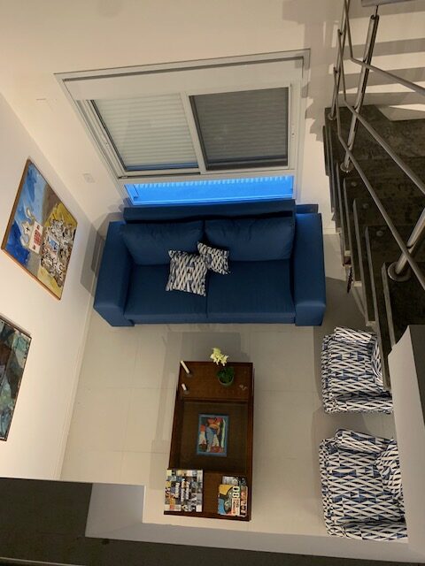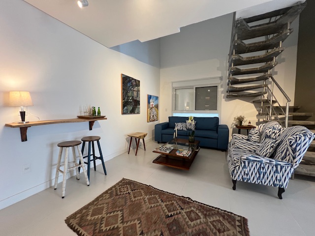Duplex único a uma quadra da praia de Jurerê Tradicional, na rua das Moreias, travessa da charmosa rua César Nascimento. O prédio dá para a rua e também para uma das belas alamedas que garantem o respiro e o distanciamento de outras construções.