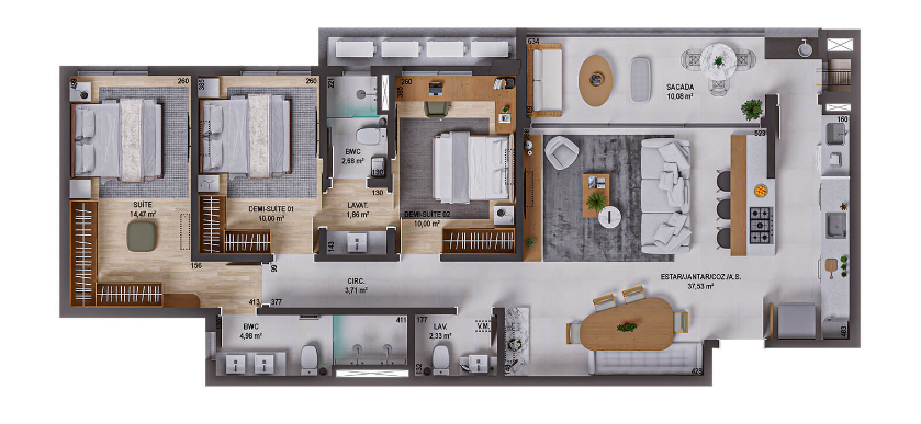 Como exemplo, trouxemos um apartamentos de 3 dormitórios sendo 1 suite e 2 demi-suites, sala e cozinha integrada, lavabo, sacada com churrasqueira, garagem com 2 vagas e hobby box